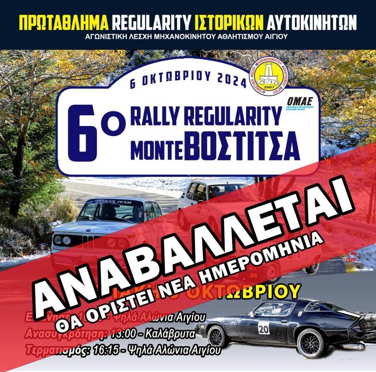 Λόγω της κρίσιμης κατάστασης της υγείας του Δημάρχου Δημήτρη Καλογερόπουλου, το Διοικητικό Συμβούλιο της ΑΛΜΑ Αιγίου, σε συνεννόηση με το Δήμο Αιγιαλείας, πήρε την απόφαση να αναβάλει τον αγώνα 6ο Rally Regularity Monte Vostitsa, ο οποίος ήταν προγραμματισμένος για την Κυριακή 6 Οκτωβρίου.