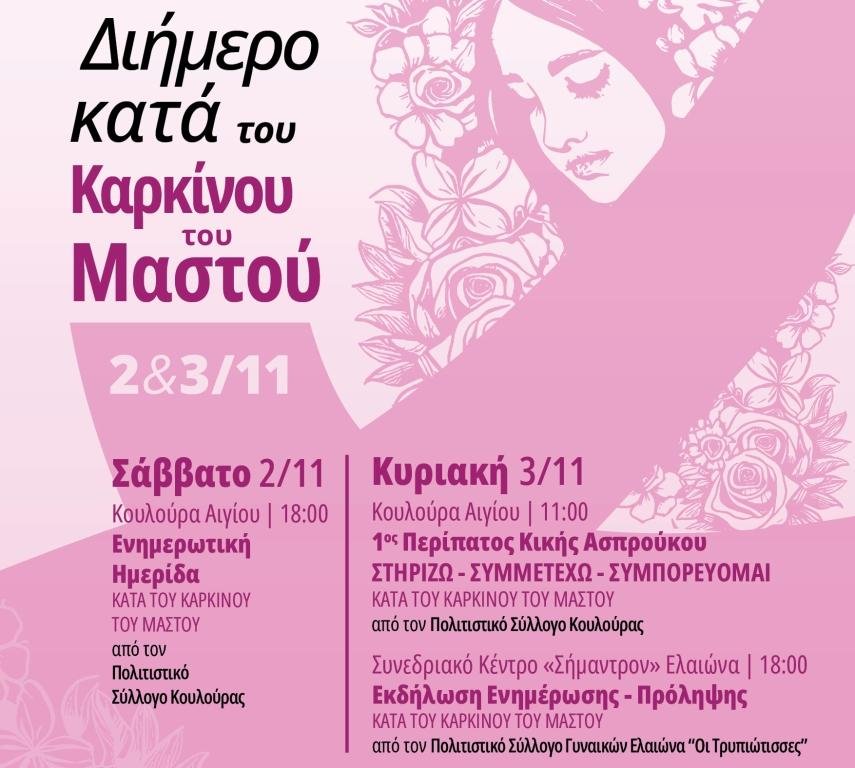 Ο Δήμος Αιγιαλείας σε συνεργασία με τη Δημοτική Επιτροπή Ισότητας, την Πρόεδρό της και Αντιδήμαρχο Νομικών Υπηρεσιών Μαρία Ιατροπούλου, την Αντιδήμαρχο Δημοσίων Σχέσεων Εθιμοτυπίας και Εκδηλώσεων Μαρία Αγγελοπούλου, τον Εντεταλμένο Δημοτικό Σύμβουλο για Αθλητικά Θέματα Χρήστο Τσερεντζούλια, τον Πολιτιστικό Σύλλογο Κουλούρας και τον Πολιτιστικό Σύλλογο Γυναικών Ελαιώνα «Οι Τρυπιώτισσες», πραγματοποιούν το Σάββατο 2 και την Κυριακή 3 Νοεμβρίου διήμερο εκδηλώσεων κατά του Καρκίνου του Μαστού.