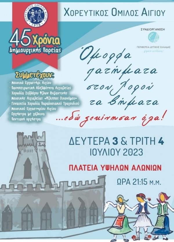 Ο Χορευτικός Όμιλος Αιγίου γιορτάζει φέτος 45 χρόνια δημιουργικής πορείας στα πολιτιστικά δρώμενα και συνδιοργανώνει με την Περιφέρεια Δυτικής Ελλάδας διήμερο μουσικοχορευτικών εκδηλώσεων με θέμα «Όμορφα πατήματα στου χορού τα βήματα… Εδώ ξεκίνησαν όλα!», που θα πραγματοποιηθεί τη Δευτέρα 3 Ιουλίου και την Τρίτη 4 Ιουλίου, στις 9:15μ.μ., στην πλατεία Υψηλών Αλωνίων.