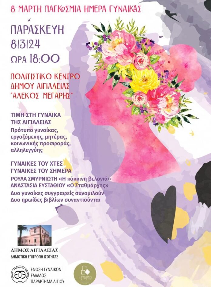 Η εκδήλωση έχει σκοπό την απόδοση τιμής στη γυναίκα της Αιγιάλειας, ως πρότυπο εργαζόμενης, μητέρας, γυναίκας με κοινωνική προσφορά και αλληλεγγύη. Παράλληλα, δύο γυναίκες συγγραφείς από την Αιγιάλεια συναντιούνται και συνομιλούν: Η Ρούλα Σμυρνιώτη με το βιβλίο της «Κόκκινη Βελονιά» και η Αναστασία Ευσταθίου με το βιβλίο της «Σταθμάρχης».