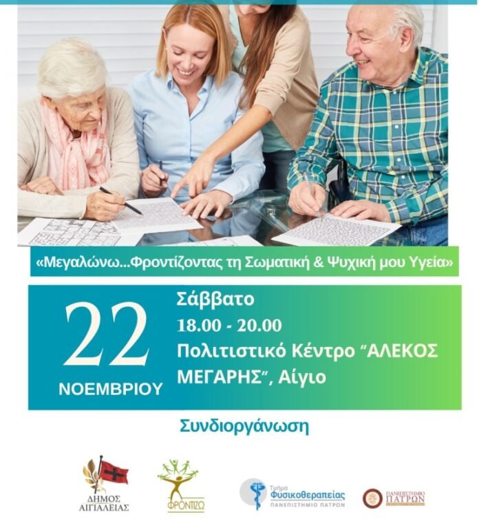 Η Aντιδημαρχία Πρόνοιας & Κοινωνικής Προστασίας Δήμου Αιγιαλείας, σε συνεργασία με το Κοινωφελές Σωματείο «Φροντίζω» και τo Τμήμα Φυσικοθεραπείας Πανεπιστημίου Πατρών, διοργανώνουν ενημερωτική εκδήλωση το Σάββατο 22 Νοεμβρίου, στις 6μ.μ., στο Πολιτιστικό Κέντρου Αιγίου «Αλέκος Μέγαρης», με τίτλο «Μεγαλώνω… Φροντίζοντας για την Σωματική & Ψυχική μου Υγεία».