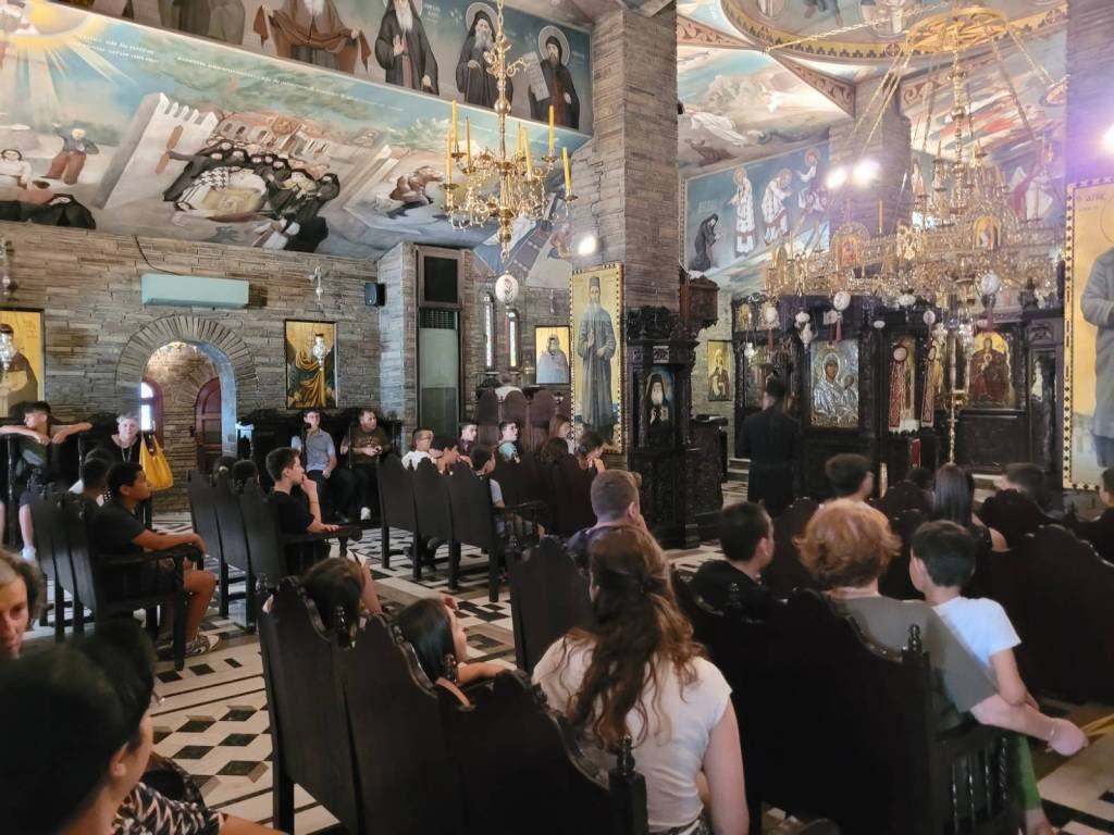 Εν συνεχεία, οι συμμετέχοντες στην εκδρομή κατευθύνθηκαν στον επόμενο προορισμό τους, στην ανδρώα Ιερά Μονή του Αγίου Αυγουστίνου Ιππώνος και Σεραφείμ του Σάρωφ, όπου τους υποδέχθηκε με ιδιαίτερη εγκαρδιότητα ο Γέροντας του Μοναστηριού π. Νεκτάριος Μουλατσιώτης μαζί με τους αδελφούς της Μονής. Εκεί, κατά την άφιξή τους, είχαν τη χαρά να απολαύσουν των ήχο των καμπανών της Ιεράς Μονής, καθώς υπάρχουν 400 σήμαντρα και 62 καμπάνες εις ανάμνησιν της Αγίας Σοφίας στην Κωνσταντινούπολη. Έπειτα επισκέφθηκαν τους χώρους της Μονής. Τα παιδιά είχαν τη δυνατότητα να ψυχαγωγηθούν στις εγκαταστάσεις της κατασκήνωσης της Ιεράς Μητροπόλεως Φωκίδος, που εδράζονται στον χώρο της Ιεράς Μονής, και να θαυμάσουν τα όμορφα ζώα που υπάρχουν στον περιβάλλοντα χώρο του Μοναστηριού. Η φιλοξενία του Γέροντα και των Μοναχών επισφραγίστηκε με το μεσημεριανό γεύμα που προσφέρθηκε σε όλους, τα παιδιά και τους κατηχητές τους, 90 άτομα συνολικά.