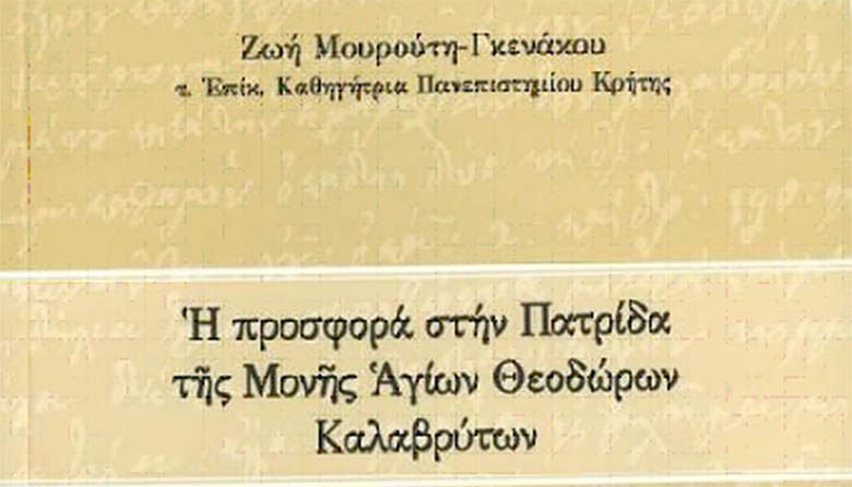 Η Ιερά Μητρόπολη Καλαβρύτων και Αιγιαλείας ανακοινώνει ότι επανεκδόθηκε (Β΄ έκδοση) και κυκλοφορεί το πνευματικό ιστορικό πόνημα υπό τον τίτλο «Η προσφορά στην Πατρίδα της Μονής Αγίων Θεοδώρων Καλαβρύτων», της εκλεκτής συγγραφέως Ζωής Μουρούτη – Γκενάκου, τ. Επίκουρης Καθηγήτριας του Πανεπιστημίου Κρήτης.