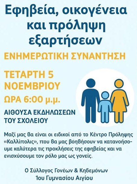 Στο Αίγιο η πρώτη Επιμορφωτική Ημερίδα για γονείς και κηδεμόνες εφήβων θα υλοποιηθεί σήμερα, Τετάρτη 5 Νοεμβρίου, στις 6μ.μ. στο 1ο Γυμνάσιο Αιγίου, με θέμα «Εφηβεία, Οικογένεια και Πρόληψη των Εξαρτήσεων», σε συνεργασία με τον Δήμο Αιγιαλείας, την Αντιδήμαρχο Εθιμοτυπίας, Δημ. Σχέσεων, Επικ/νίας, Συναφών Εκδηλώσεων Μαρία Αγγελοπούλου & τον Αντιδήμαρχο Παιδείας, Διοίκησης – ΚΕΠ Δημήτρη Ελευθεριώτη.