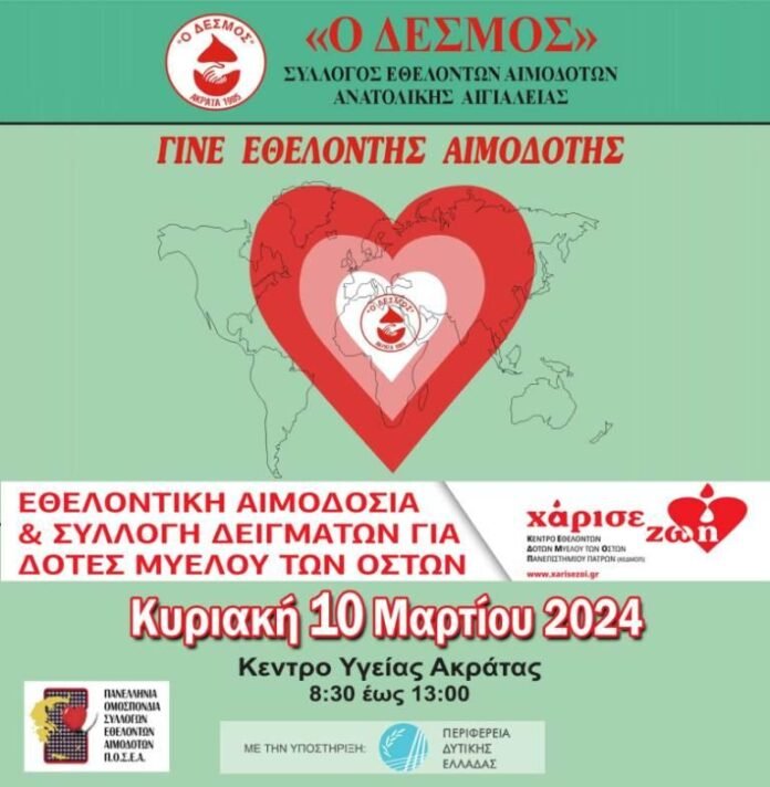 Ο Σύλλογος Εθελοντών Αιμοδοτών Ανατολικής Αιγιαλείας «Ο Δεσμός» διοργανώνει εθελοντική αιμοδοσία, την Κυριακή 10 Μαρτίου, από τις 8.30π.μ. έως τη 1μ.μ. στο Κέντρο Υγείας Ακράτας.