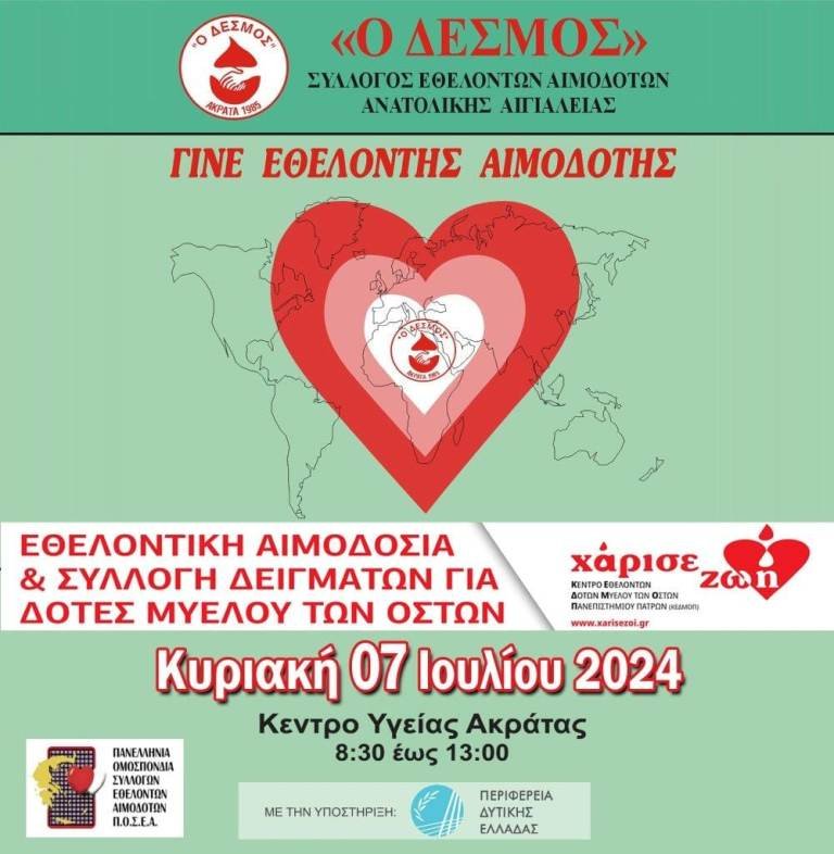 Ο Σύλλογος Εθελοντών Αιμοδοτών Ανατολικής Αιγιαλείας «Ο Δεσμός» διοργανώνει εθελοντική αιμοδοσία την Κυριακή 7 Ιουλίου, από τις 8.30π.μ. έως τη 1μ.μ., στο Κέντρο Υγείας Ακράτας.