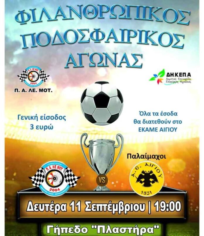 Η Παναιγιάλεια Αθλητική Λέσχη Μοτοσικλέτας (Π.Α.ΛΕ.ΜΟΤ.) διοργανώνει την ερχόμενη Δευτέρα 11 Σεπτεμβρίου, στις 7μ.μ., φιλανθρωπικό αγώνα ποδοσφαίρου με σκοπό να μυηθούν όσο γίνεται περισσότερα  μέλη της λέσχης στον Αθλητισμό και την ευγενή άμιλλα. Ο αγώνας θα πραγματοποιηθεί με τη συνδιοργάνωση της ΔΗ.Κ.ΕΠ.Α. Αιγιαλείας και το Ν.Π.Δ.Δ. του Δήμου Αιγιαλείας και θα αναμετρηθούν τα μέλη της Λέσχης με την ομάδα παλαιμάχων της ΑΕ Αιγίου.