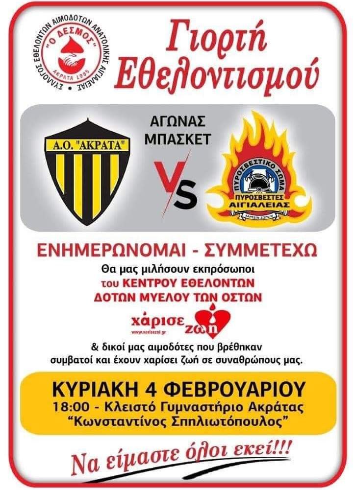 Γιορτή Εθελοντισμού με αγώνα μπάσκετ μεταξύ του Αθλητικού Ομίλου «Ακράτα» και Πυροσβεστών από την Αιγιάλεια οργανώνει την ερχόμενη Κυριακή (4/2) ο Σύλλογος Εθελοντών Αιμοδοτών Ανατολικής Αιγιαλείας.