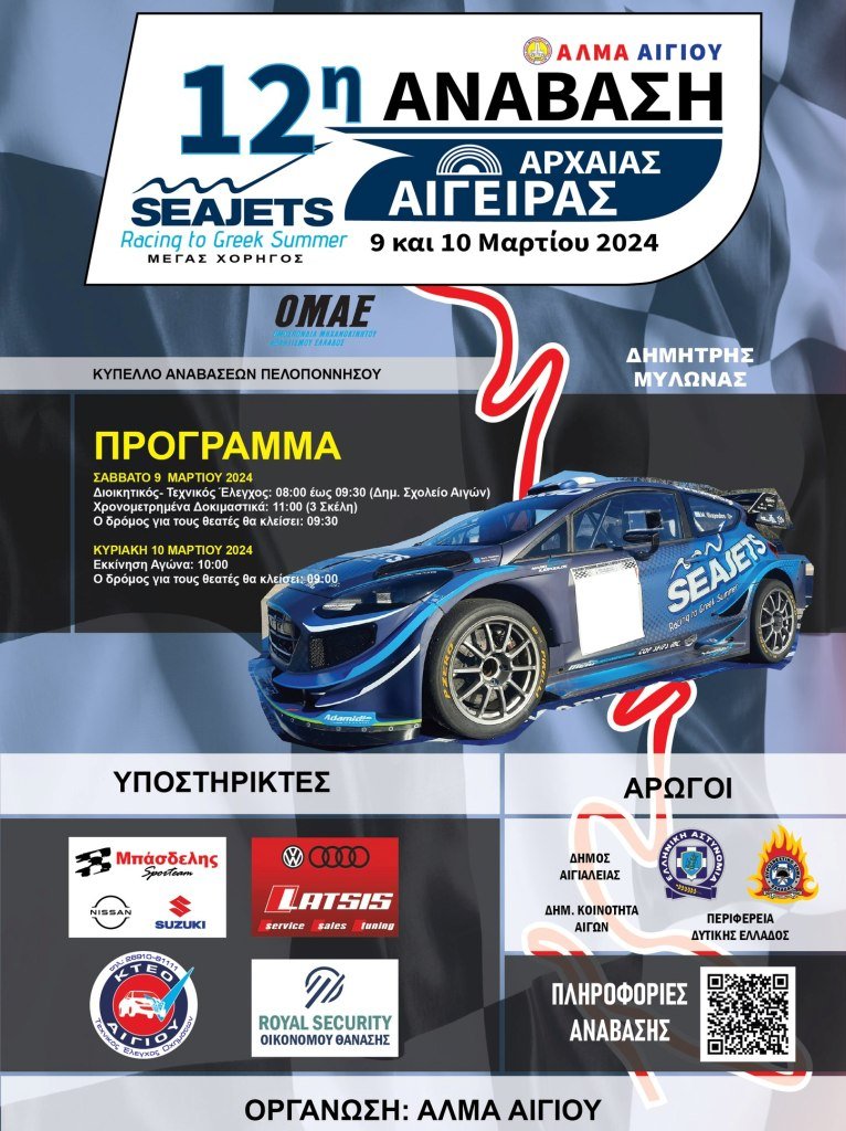 Η 12η SEAJETS Ανάβαση Αρχαίας Αιγείρας ανοίγει αυτό το Σαββατοκύριακο 9-10 Μαρτίου την «αυλαία» των αγώνων αναβάσεων αυτοκινήτου καθώς θα πραγματοποιηθεί στην πανέμορφη διαδρομή από το χωριό Αιγές έως το Αρχαίο Θέατρο Αιγείρας, με μήκος 3.150 μέτρα.