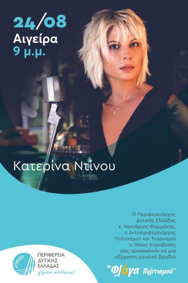 Καλοκαίρι 2023 και η «Φλόγα Πολιτισμού» της Περιφέρειας Δυτικής Ελλάδας υποδέχεται την Κατερίνα Ντίνου που, μαζί με τη μουσική της συντροφιά, θα ταξιδέψει όλους, την Πέμπτη 24/8 και ώρα 21:00 στο Δημοτικό σχολείο Αιγείρας, σε όλα τα μήκη και τα πλάτη της έντεχνης ελληνικής καλλιτεχνικής δημιουργίας.