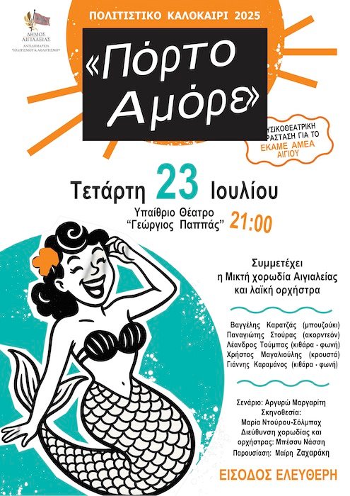 Ο Δήμος Αιγιαλείας για τέταρτη συνεχόμενη χρονιά διοργανώνει μια εκδήλωση, τα έσοδα της οποίας θα υποστηρίξουν το ΕΚΑΜΕ ΑμεΑ Αιγίου. Σήμερα, Τετάρτη 23 Ιουλίου, στις 9μ.μ. στο υπαίθριο θέατρο «Γ. Παππάς», η Μικτή χορωδία Αιγιαλείας παρουσιάζει την πρωτότυπη μουσικοθεατρική παράσταση εποχής με τίτλο «Πόρτο Αμόρε», με θέμα τον έρωτα, τον πόνο των ξενιτεμένων και τα συναισθήματα στο λιμάνι του αποχωρισμού, γεμάτη δάκρυ, γέλιο, ίντριγκες και σασπένς…