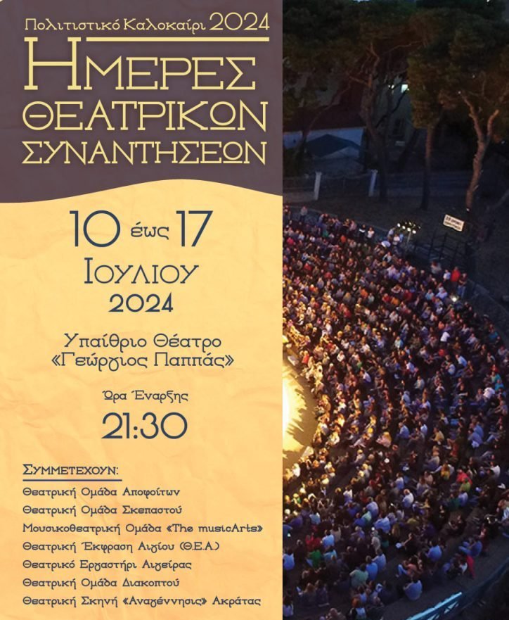 Οι «Ημέρες Θεατρικών Συναντήσεων» έρχονται και πάλι υπό την αιγίδα της Αντιδημαρχίας Πολιτισμού και Αθλητισμού και στο πλαίσιο των εκδηλώσεων του «Πολιτιστικού Καλοκαιριού 2024» του Δήμου Αιγιαλείας.