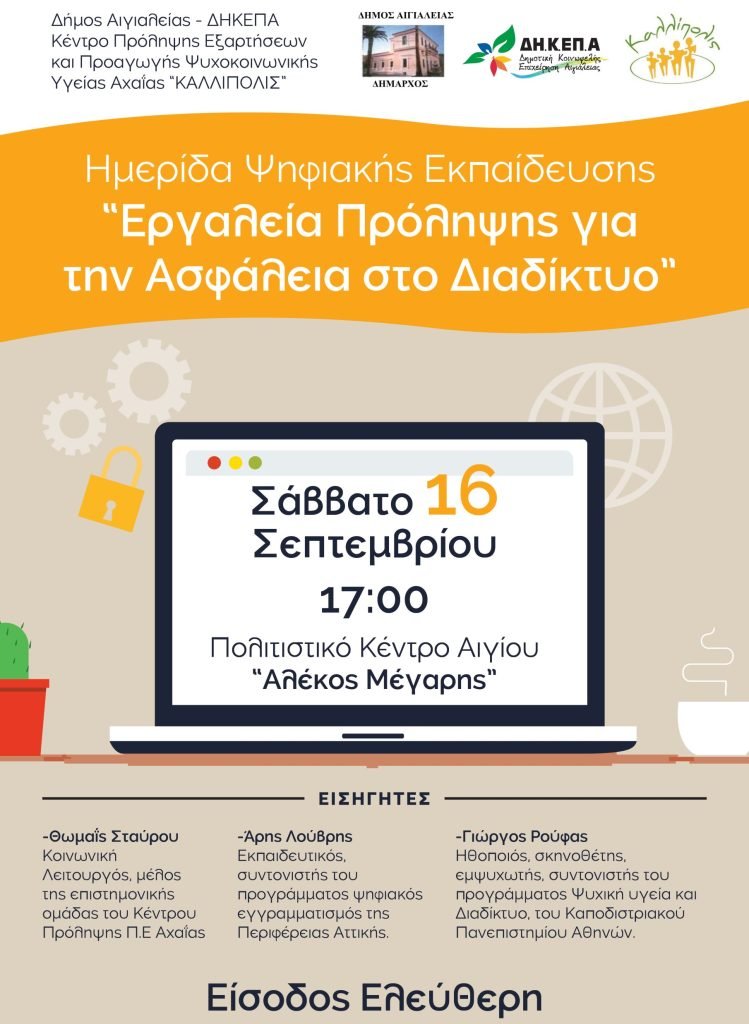 Ο Δήμος Αιγιαλείας, σε συνεργασία με την ΔΗΚΕΠΑ και το Κέντρο Πρόληψης Εξαρτήσεων και Προαγωγής Ψυχοκοινωνικής Υγείας Αχαΐας «ΚΑΛΛΙΠΟΛΙΣ», θα πραγματοποιήσει την Ημερίδα Ψηφιακής Εκπαίδευσης «Εργαλεία Πρόληψης για την Ασφάλεια στο Διαδίκτυο», το Σάββατο 16 Σεπτεμβρίου, στις 5μ.μ., στο Πολιτιστικό Κέντρο Αιγίου «Αλέκος Μέγαρης».
