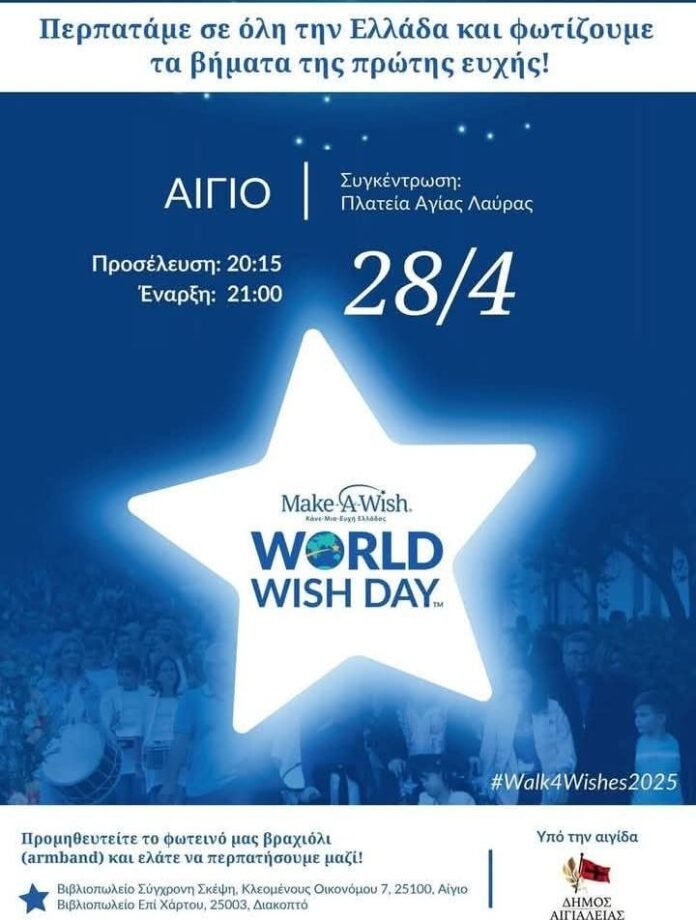 Για δεύτερη χρονιά ο Δήμος Αιγιαλείας συνεργάζεται με το «MAKE A WISH» και τις οικογένειες των ευχών της Αιγιάλειας, τιμώντας την Παγκόσμια Ημέρα Ευχών (Make a Wish – World Wish Day 2025), με σκοπό να περπατήσουμε όλοι μαζί ειρηνικά τον περίπατο των Ευχών!