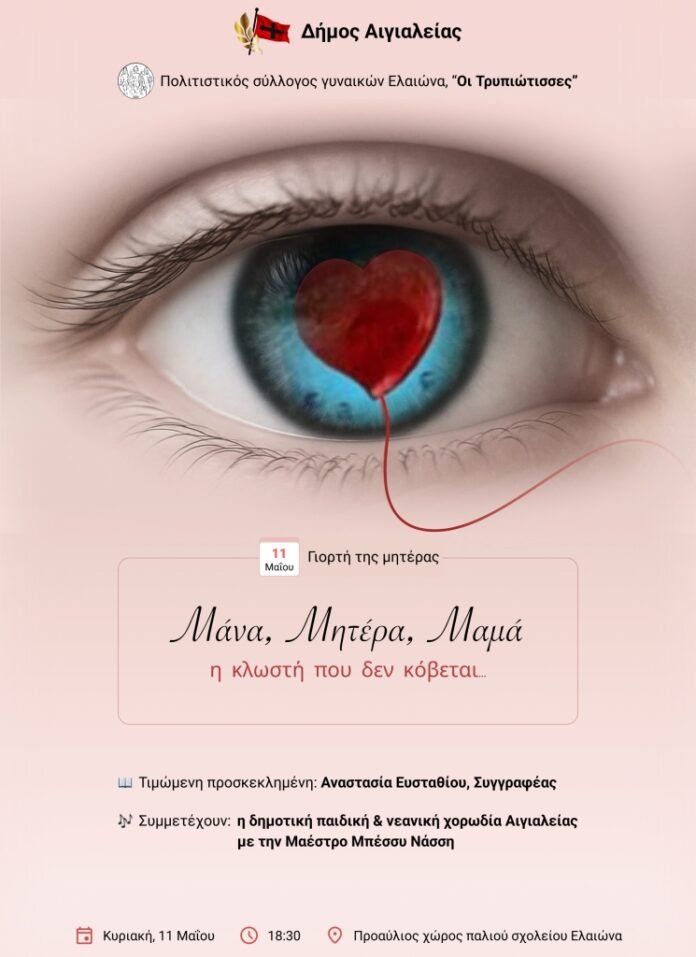 Ο Πολιτιστικός Σύλλογος Γυναικών Ελαιώνα «Οι Τρυπιώτισσες», υπό την αιγίδα του Δήμου Αιγιαλείας και της Δημοτικής Επιτροπής Ισότητας, διοργανώνει την Κυριακή 11 Μαΐου, στις 6.30μ.μ. στον προαύλιο χώρο του Παλιού Δημοτικού Σχολείου Ελαιώνα, μια ξεχωριστή εκδήλωση αφιερωμένη στη Μητέρα, που είναι η καρδιά και ο πυρήνας της ζωής.