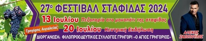 Ο Φιλοπροοδευτικός Σύλλογός Γρηγόρη «Ο Άγιος Γρηγόριος» προγραμματίζει για φέτος τις εκδηλώσεις του 27ου Φεστιβάλ Σταφίδας 2024. Κατά τον μήνα Ιούλιο διοργανώνει τις εξής εκδηλώσεις: