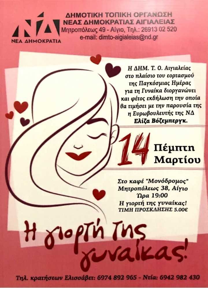 Η ΔΗΜ.Τ.Ο. ΝΔ  Αιγιαλείας, στο πλαίσιο εορτασμού της Παγκόσμιας Ημέρας της Γυναίκας, διοργανώνει και φέτος εκδήλωση, την οποία θα τιμήσει με την παρουσία της η Ευρωβουλευτής της ΝΔ Ελίζα Βόζεμπεργκ.
