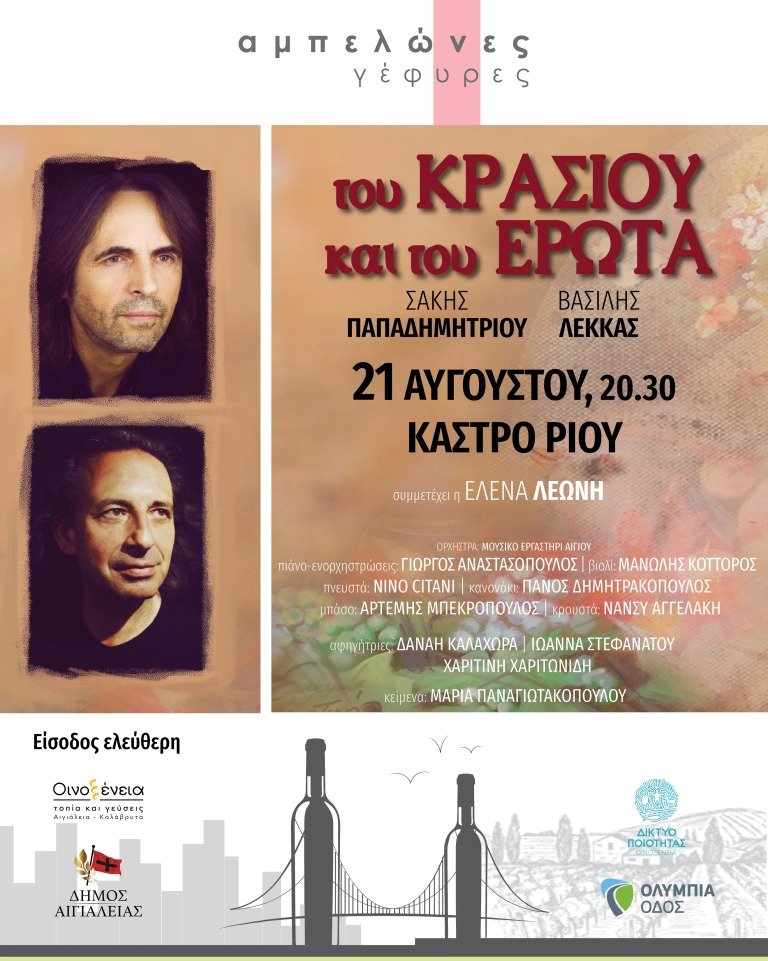 Με το έργο «Του Κρασιού και του Έρωτα» του Αιγιώτη συνθέτη Σάκη Παπαδημητρίου με αρχαία μελοποιημένη λυρική ποίηση, που αποτελεί ορόσημο και παράλληλα σημείο αναφοράς για το κρασί ως άξονα πολιτισμού, κάνει την avant premiere του ο θεσμός «Οινοξένεια 2024» αύριο, Τετάρτη 21 Αυγούστου, στις 8.30μ.μ. στο εμβληματικό Κάστρο του Ρίου, σηματοδοτώντας έτσι το κεντρικό μήνυμα της φετινής διοργάνωσης που είναι «Αμπελώνες – Γέφυρες».