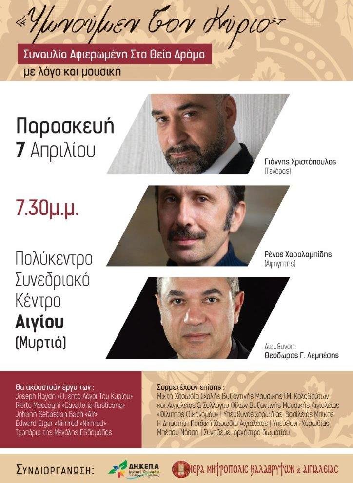 Μία ξεχωριστή συναυλία αφιερωμένη στο Θείο Δράμα, υπό τον τίτλο «Ὑμνοῦμεν τόν Κύριο», συνδιοργανώνουν η ΔΗ.Κ.ΕΠ.Α. και η Ιερά Μητρόπολη Καλαβρύτων και Αιγιαλείας, την Παρασκευή 7 Απριλίου στις 7.30μ.μ. στο Πολύκεντρο Συνεδριακό Κέντρο Αιγίου (Μυρτιά).