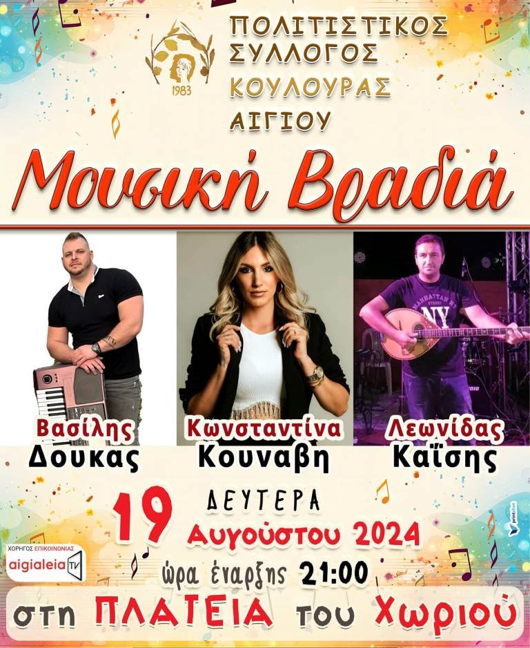 Μία πολύ ωραία εκδήλωση διοργανώνει την ερχόμενη Δευτέρα, 19 Αυγούστου, στις 9μ.μ., το δραστήριο ΔΣ του Πολιτιστικού Συλλόγου Κουλούρας Αιγίου, προσκαλώντας όλους τους Αιγιώτες (και όχι μόνο) να παραβρεθούν στον προαύλιο χώρο του Ιερού Ναού της Υπαπαντής του Κυρίου.