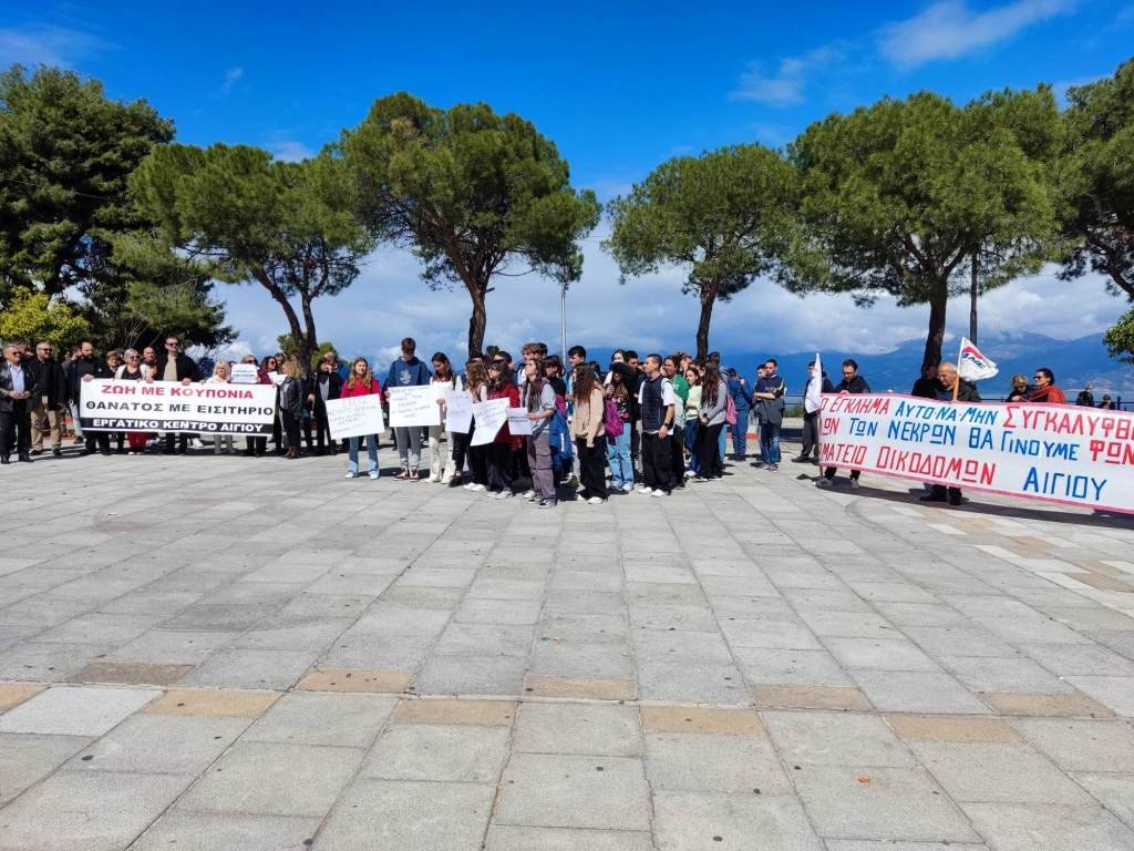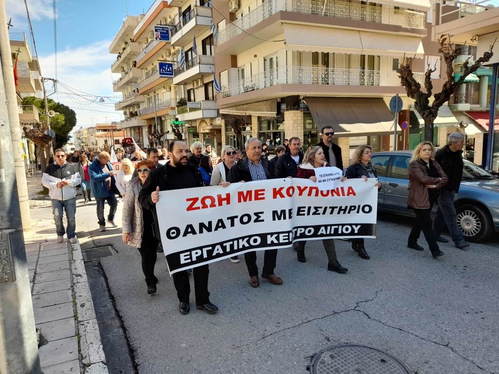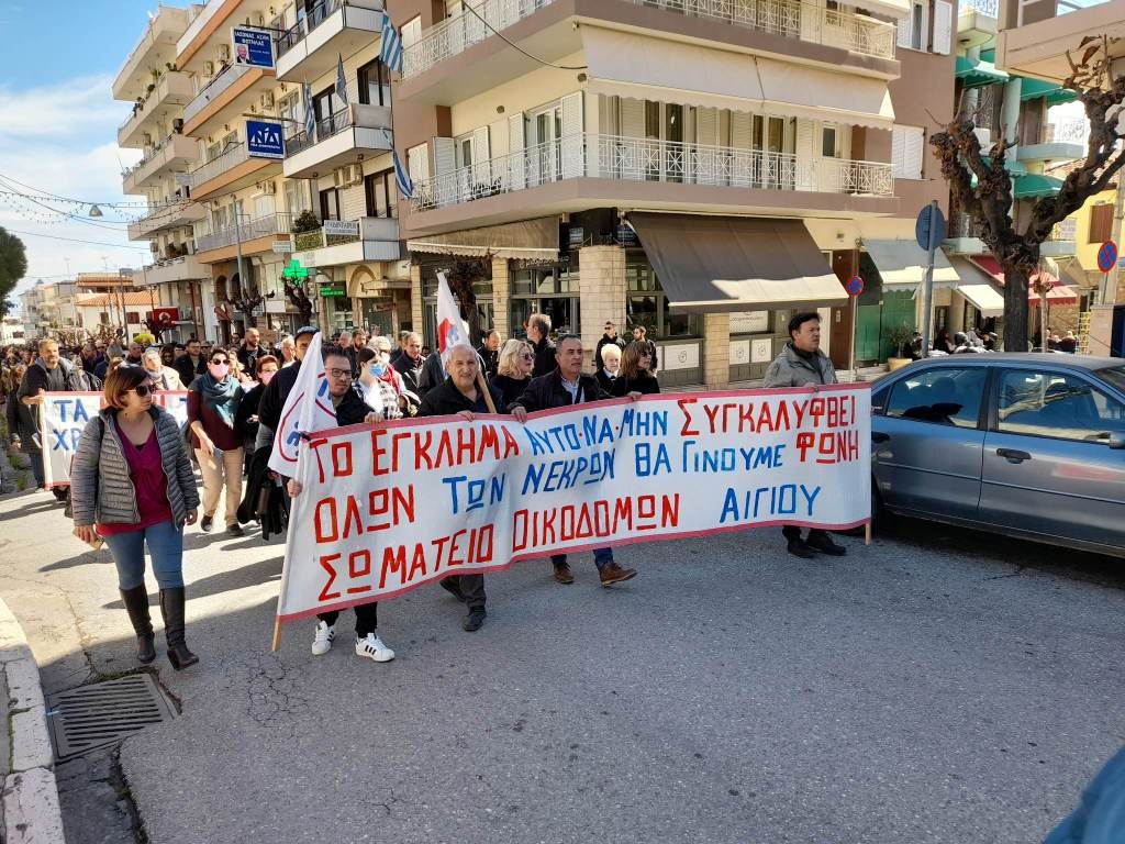 Εκατοντάδες εργαζόμενοι, άνεργοι, συνταξιούχοι, μαθητές των σχολείων του Αιγίου και φοιτητές εξέφρασαν με την συγκέντρωσή τους αλλά και την πορεία που πραγματοποίησαν στους κεντρικούς δρόμους της πόλης την οργή τους για τη σιδηροδρομική τραγωδία, δηλώνοντας παράλληλα πως «δεν θα ησυχάσουν μέχρι να μπουν στη φυλακή οι εγκληματίες».