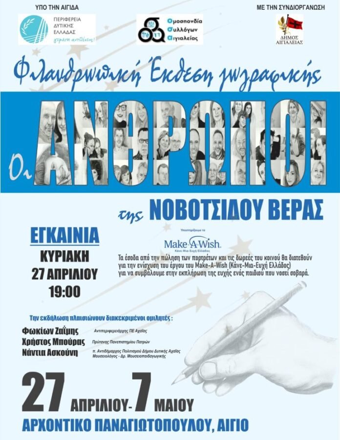 Μια τέτοια στιγμή είναι η φιλανθρωπική εικαστική έκθεση «Οι Άνθρωποι», που διοργανώνεται από την Ομοσπονδία Συλλόγων Αιγιαλείας (ΟΣΑ) και την εικαστικό Βέρα Νοβοτσίδου, σε συνδιοργάνωση με το Δήμο Αιγιαλείας και υπό την αιγίδα της Περιφέρειας Δυτικής Ελλάδας