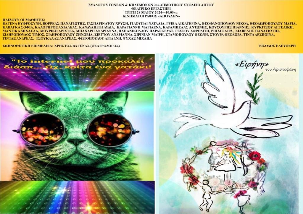 Δύο παιδικές θεατρικές παραστάσεις με τίτλους «Το internet μου προκαλεί διάσπ….. Ωχ κοίτα ένα γατάκι!» και «Ειρήνη» του Αριστοφάνη παρουσιάζει αύριο, Τρίτη 28 Μαΐου, στο κινηματοθέατρο «Απόλλων» ο Σύλλογος Γονέων και Κηδεμόνων του 2ου δημοτικού σχολείου Αιγίου.