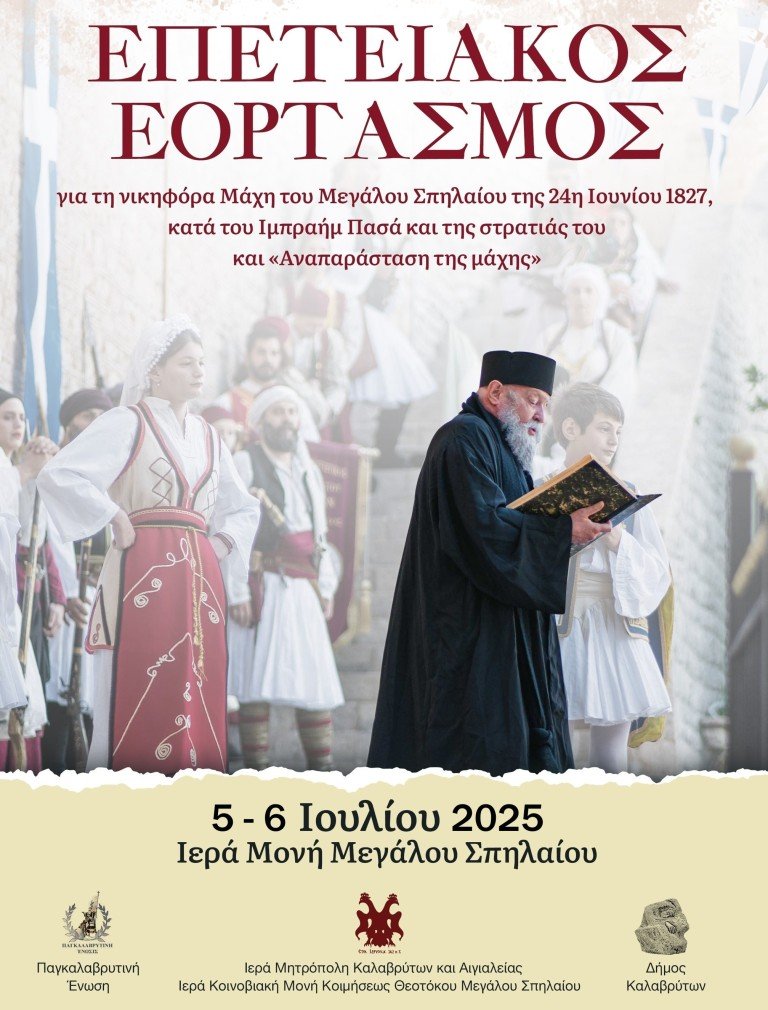 Με την ευλογία του Σεβασμιωτάτου κ. Ιερωνύμου θα εορτασθεί και εφέτος, στις 5 και 6 Ιουλίου, η επέτειος της Μάχης του Μεγάλου Σπηλαίου κατά του Ιμπραήμ Πασά και της στρατιάς του, η οποία διεξήχθη την 24η Ιουνίου 1827 στην Ιερά Μονή του Μεγάλου Σπηλαίου.