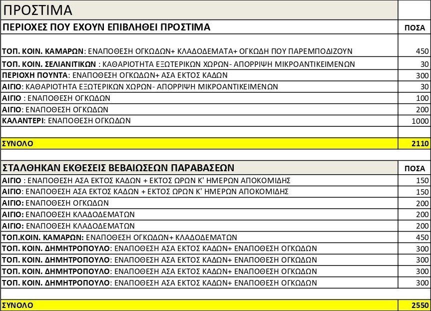 Ενδεικτική λίστα προστίμων που έχουν επιβληθεί ή έχουν σταλθεί εκθέσεις βεβαιώσεων παραβάσεων και που αφορούν σε παραβάσεις του Κανονισμού Καθαριότητας απέστειλε ο Δήμος Αιγιαλείας. Τα πρόστιμα αφορούν σε παράνομη εναπόθεση ογκωδών απορριμμάτων και κλαδοδεμάτων αλλά και σε απόρριψη απορριμμάτων εκτός κάδων.