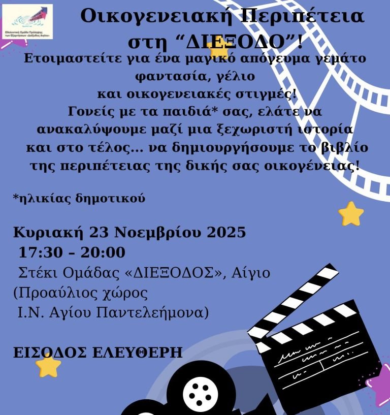 Η Εθελοντική Ομάδα Πρόληψης «Διέξοδος» Αιγίου του Κέντρου Πρόληψης των Εξαρτήσεων και Προαγωγής της Ψυχοκοινωνικής Υγείας Π.Ε. Αχαΐας «Καλλίπολις», που λειτουργεί σε συνεργασία με τον Ε.Ο.Π.Α.Ε και την υποστήριξη του Δήμου Αιγιαλείας, προσκαλεί την Κυριακή 23 Νοεμβρίου και ώρα 17:30 – 20:00 οικογένειες (γονείς και παιδιά ηλικίας δημοτικού σχολείου) για να παρακολουθήσουν μαζί μια ιστορία πλούσια σε συναισθήματα, φαντασία και ανατροπές.