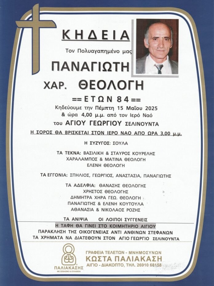 ΑΙΓΙΑΛΕΙΑΚΟΙΝΩΝΙΚΑ “Έφυγε” ο 84χρονος Παναγιώτης Χαρ. Θεολόγης – Την Πέμπτη (15/5) το “τελευταίο αντίο” από τον Ιερό Ναό Αγίου Γεωργίου Σελινούντα Από AigialeiaTv - 14 Μαΐου, 2025 0 48 FacebookX