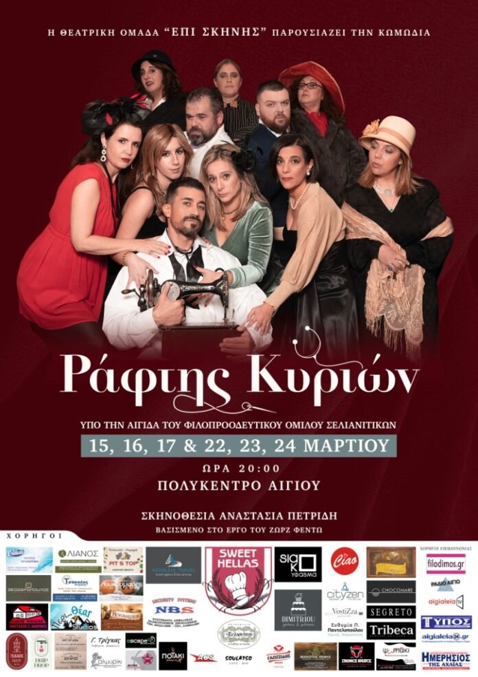 Η Θεατρική Ομάδα «Επί Σκηνής» υπό την αιγίδα του Φιλοπροοδευτικού Ομίλου Σελιανιτίκων επανέρχεται και φέτος με τη δημοφιλή θεατρική κωμωδία «Ράφτης Κυριών» του Ζωρζ Φεντώ, σε σκηνοθεσία της Αναστασίας Πετρίδη στο Πολύκεντρο Αιγίου για 6 παραστάσεις (στις 15-16-17 Μαρτίου και στις 22-23-24 Μαρτίου).