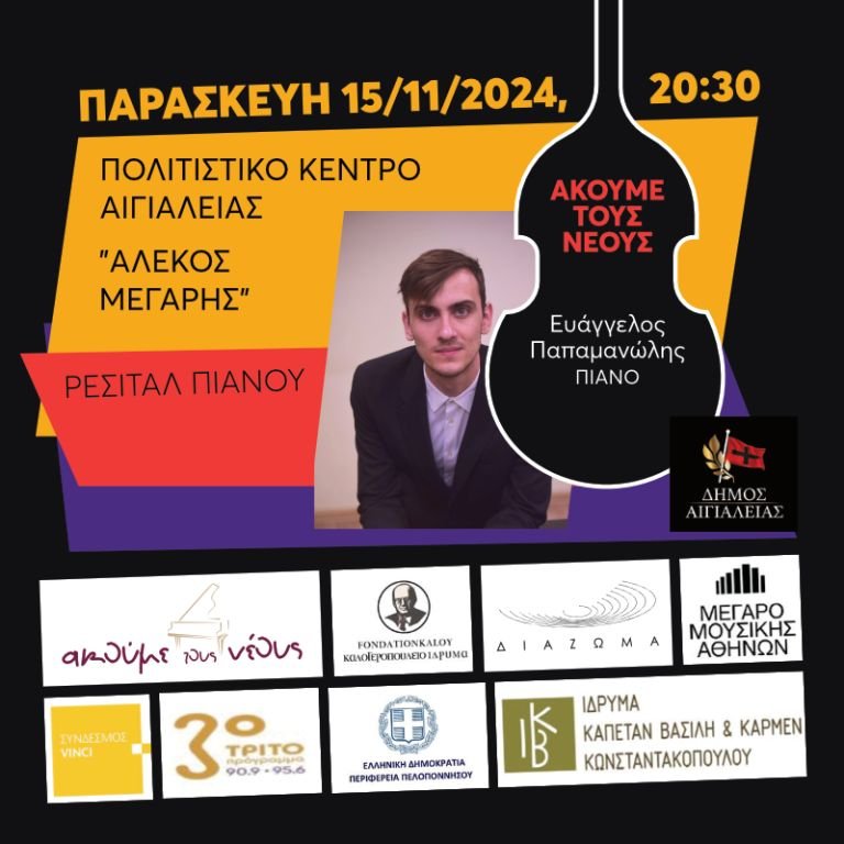 Ρεσιτάλ πιάνου του ταλαντούχου και πολυβραβευμένου Ευάγγελου Παπαμανώλη διοργανώνει ο Δήμος Αιγιαλειας σε συνεργασία με το Καλογεροπούλειο Ίδρυμα Κορίνθου την Παρασκευή 15 Νοεμβρίου, στις 8:30μ.μ. στο Πολιτιστικό Κέντρο Αιγίου «Αλέκος Μέγαρης» στο πλαίσιο του προγράμματος «Ακούμε τους Νέους 2024».