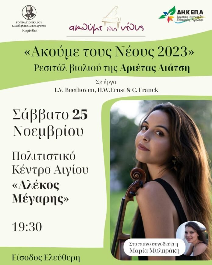 Ρεσιτάλ βιολιού της ταλαντούχας και πολυβραβευμένης Αριέτας Λιάτση διοργανώνει η ΔΗ.Κ.ΕΠ.Α. σε συνεργασία με το Καλογεροπούλειο Ίδρυμα Κορίνθου, το Σάββατο 25 Νοεμβρίου, στις 7:30μ.μ., στο Πολιτιστικό Κέντρο Αιγίου «Αλέκος Μέγαρης», στο πλαίσιο του προγράμματος «Ακούμε τους Νέους 2023». Στο πιάνο συνοδεύει η αναγνωρισμένη πιανίστα Μαρία Μυλαράκη.