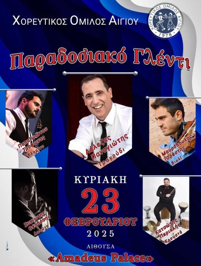 Ο Χορευτικός όμιλος Αιγίου διοργανώνει «Παραδοσιακό Γλέντι» στην αίθουσα AMADEUS PALACE την Κυριακή 23 Φεβρουαρίου στη 1μ.μ., με ζωντανή μουσική από 5μελή ορχήστρα με τον Παναγιώτη Λάλεζα στο τραγούδι, τον Τρύφωνα Παπαϊωάννου στο κλαρίνο, τον Ορέστη Μαυρόπουλο στο βιολί, τον Θεοδόση Συκιώτη στο λαούτο και τον Περικλή Κατσώτη στα κρουστά. Προσκλήσεις – Κρατήσεις καθημερινά 19:30-22:00 στα γραφεία του Ομίλου.