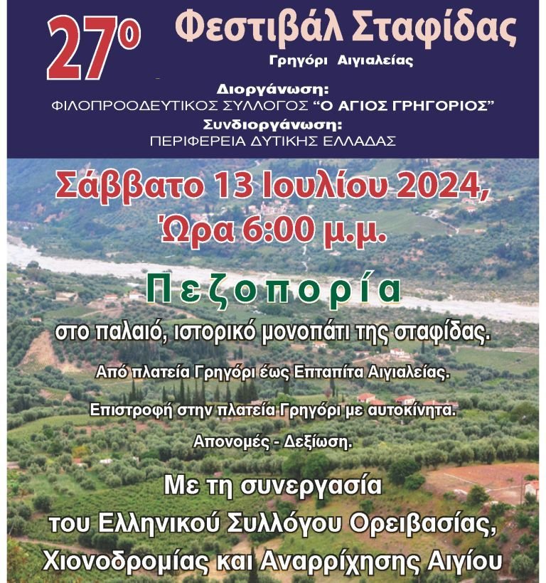 Σήμερα, Σάββατο 13 Ιουλίου, στις 6μ.μ., θα πραγματοποιηθεί η πεζοπορία στο παλαιό μονοπάτι της Σταφίδας, που διοργανώνει φέτος ο Φιλοπροοδευτικός Σύλλογος Γρηγόρι «Ο Άγιος Γρηγόριος» στο πλαίσιο του 27ου Φεστιβάλ Σταφίδας. Οι συμμετοχές ξεπερνούν τις προσδοκίες των διοργανωτών, καθώς έχουν δηλώσει συμμετοχή άτομα του χωριού Γρηγόρη (ενήλικες και παιδιά) αλλά και άτομα από την ευρύτερη περιοχή. Οι δηλώσεις συμμετοχής συνεχίζονται στην Αδαμαντία Σολδάτου (τηλ.: 6937 097315).