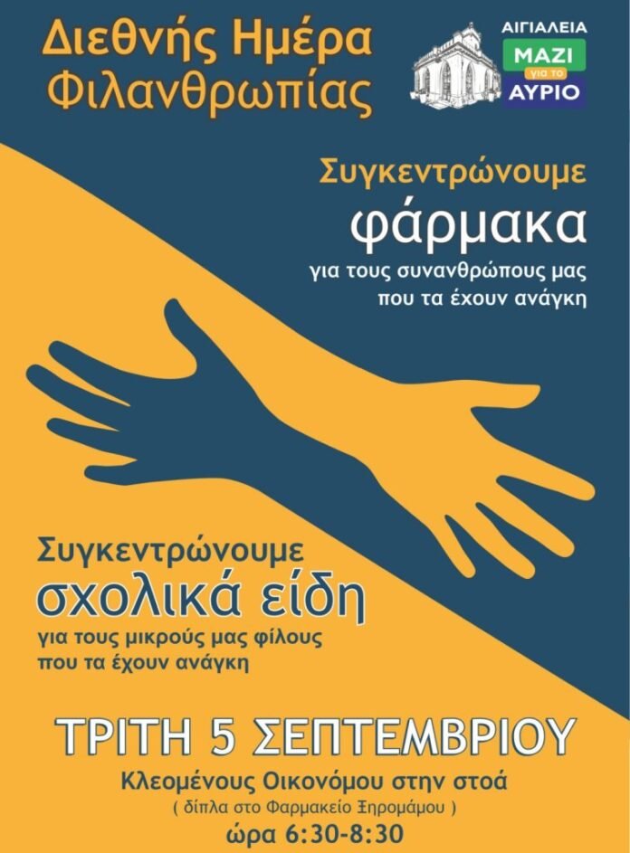 Σήμερα, Τρίτη 5 Σεπτεμβρίου, πραγματοποιείται η μεγάλη ανθρωπιστική δράση της Εθελοντικής Ομάδας της παράταξης «Αιγιάλεια Μαζί για το Αύριο» με σκοπό την συγκέντρωση φαρμάκων και σχολικής ύλης, στο πλαίσιο της Διεθνούς Ημέρας Φιλανθρωπίας, όπως έχει καθιερωθεί με απόφαση του ΟΗΕ η σημερινή ημέρα.