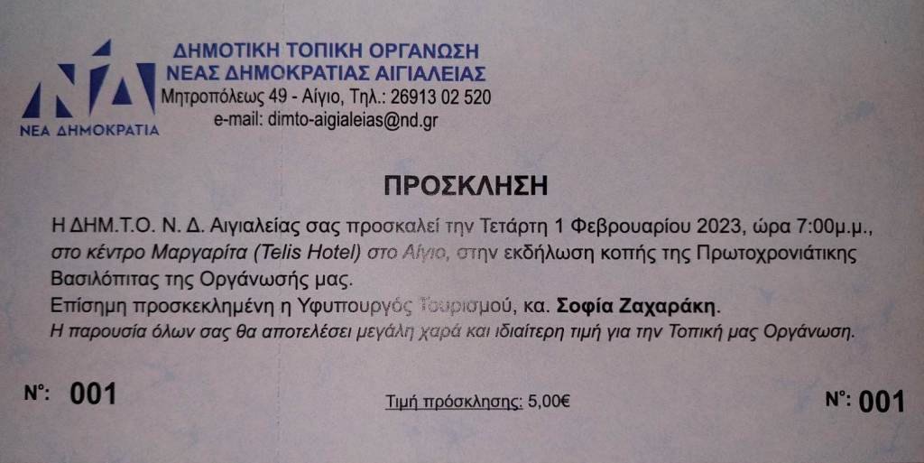Στην τελική ευθεία για την όσο το δυνατόν καλύτερη προετοιμασία και οργάνωση της εκδήλωσης κοπής της πρωτοχρονιάτικης πίτας που έχει προγραμματιστεί για την Τετάρτη 1η Φεβρουαρίου με επίσημη προσκεκλημένη την Υφυπουργό Τουρισμού Σοφία Ζαχαράκη, εισέρχονται πλέον τα μέλη του Δ.Σ. της Δημοτικής Τοπικής Οργάνωσης Νέας Δημοκρατίας Αιγιάλειας.