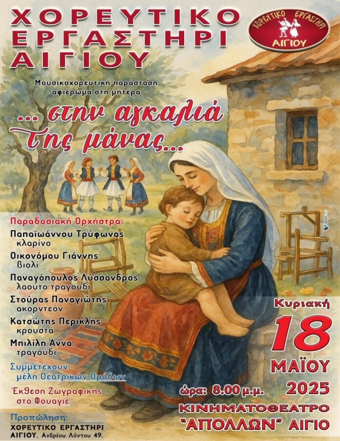 Την Κυριακή 18 Μαΐου, στις 8μ.μ., στο κινηματοθέατρο «Απόλλων» στο Αίγιο, το Χορευτικό Εργαστήρι Αιγίου θα παρουσιάσει στο κοινό της Αιγιάλειας την παράσταση «…στην αγκαλιά της μάνας…». Λόγος, τραγούδια, χοροί, ποίηση, εικόνες, δρώμενα διαρθρωμένα σε επτά ενότητες αποτελούν το αφιέρωμα στη Μητέρα και στη γιορτή της.