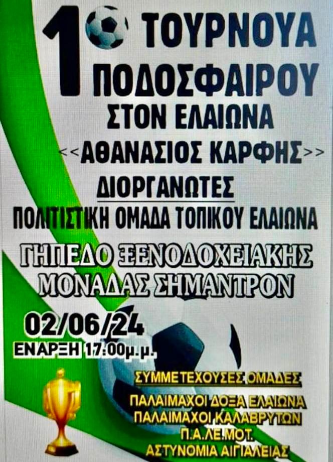 Με τη συμμετοχή τεσσάρων ομάδων την Κυριακή 2 Μαΐου θα διεξαχθεί στον Ελαιώνα μίνι ποδοσφαιρικό τουρνουά στη μνήμη του προέδρου της τοπικής Δόξας Αθανασίου Καρφή. Τη διεξαγωγή του τουρνουά έχει αναλάβει η πολιτιστική ομάδα Ελαιώνα και θα γίνει στο γήπεδο της Ξενοδοχειακής Μονάδας «Σήμαντρον» με ώρα έναρξης 5μ.μ.