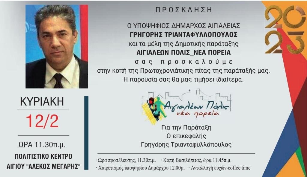 Συνάντηση για κοπή της πρωτοχρονιάτικης πίτας και ανταλλαγή ευχών διοργανώνει η παράταξη «Αιγιαλέων Πόλις – Νέα Πορεία» και ο υποψήφιος δήμαρχος Αιγιαλείας Γρηγόρης Τριανταφυλλόπουλος το πρωί της ερχόμενης Κυριακής 12 Φεβρουαρίου, στην αίθουσα εκδηλώσεων του Πολιτιστικού Κέντρου Αιγίου «Αλέκος Μέγαρης».