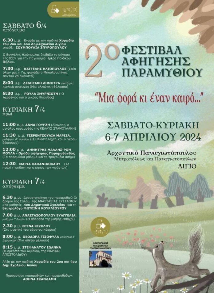 Η πρωτοτυπία φέτος είναι ότι στο φεστιβάλ θα συμμετέχουν παιδιά από το Αίγιο (μαθητές και φοιτητές) που γράφουν παραμύθια και που πιθανόν να είναι οι μελλοντικοί παραμυθάδες.