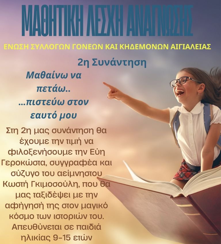 Η δεύτερη συνάντηση της Μαθητικής Λέσχης Ανάγνωσης της Ένωσης Συλλόγων Γονέων και Κηδεμόνων Αιγιαλείας με θέμα «Μαθαίνω να πετάω… πιστεύω στον εαυτό μου», θα πραγματοποιηθεί το ερχόμενο Σάββατο, 1η Φεβρουαρίου, στον χώρο των Παλαιών Σφαγείων Αιγίου.
