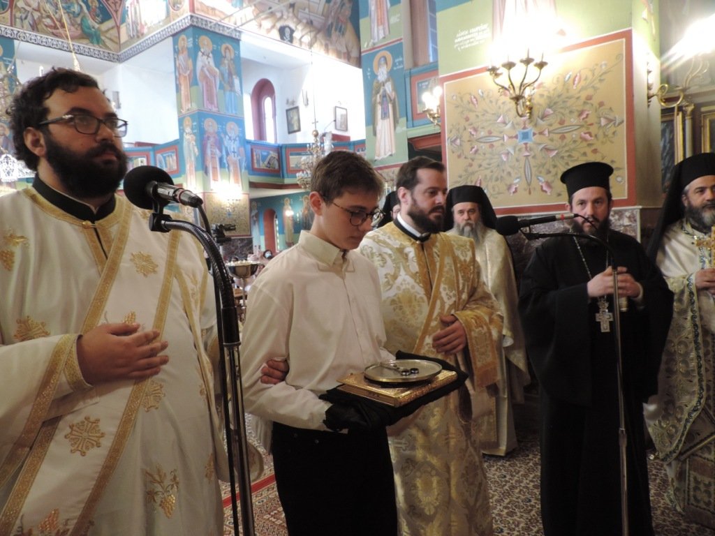 Λίγο πριν το πέρας της Θείας Λειτουργίας, πραγματοποιήθηκε, με πρωτοβουλία του κ. Ιερωνύμου, η χειροθεσία σε Αναγνώστη του Κωνσταντίνου Σακελλαρίου, μαθητού της πρώτης τάξης του 2ου ΓΕΛ Αιγίου, για την ένθερμη πίστη του στον Χριστό και την αφοσίωσή του στην εκμάθηση της ψαλτικής τέχνης, καθώς μετέχει ενεργά στο ιερό ψαλτήριο κατά τις Ιερές Ακολουθίες.