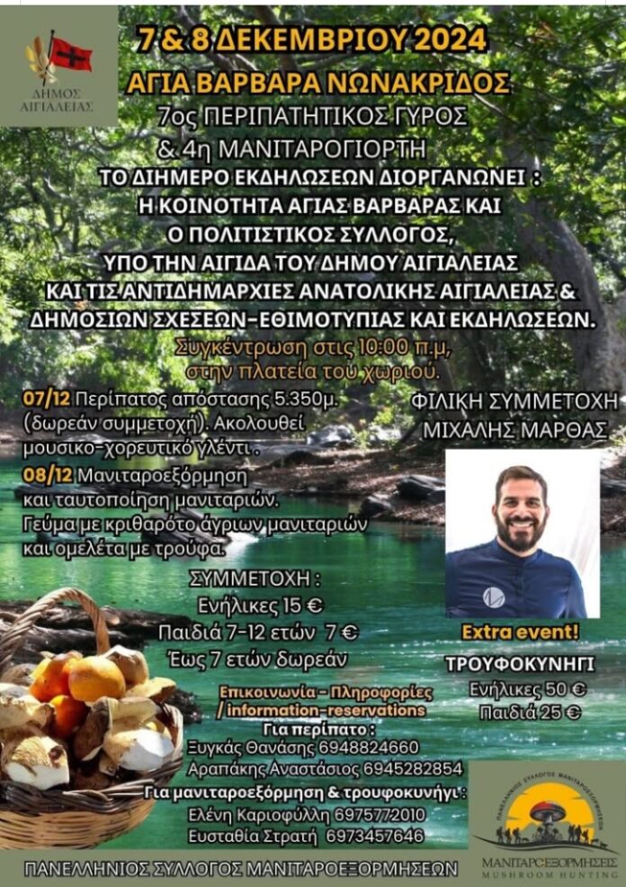 Η Κοινότητα Αγίας Βαρβάρας Αιγιαλείας, σε συνεργασία με τον Πολιτιστικό Σύλλογο «Τα Ματσόνια» και υπό την αιγίδα του Δήμου Αιγιάλειας και με την ευθύνη της Αντιδημαρχίας Δημοσίων Σχέσεων – Επικοινωνίας – Εθιμοτυπίας – Συναφών Εκδηλώσεων, διοργανώνουν τον ετήσιο 7ο περιπατητικό γύρο Αγίας Βαρβάρας και την 4η Μανιταροεξόρμηση, σε ένα πλούσιο διήμερο εκδηλώσεων στις 7 και 8 Δεκεμβρίου.