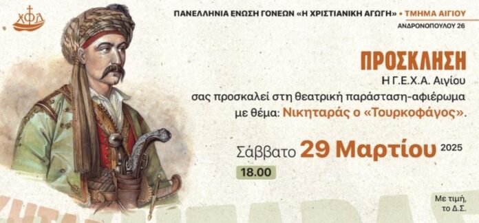 Θεατρική παράσταση – αφιέρωμα με θέμα «Νικηταράς ο Τουρκοφάγος» θα πραγματοποιηθεί σήμερα, Σάββατο 29 Μαρτίου, στη ΓΕΧΑ Αιγίου (Ανδρονοπούλου 26).